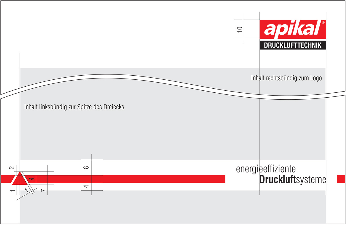 Wenn Logo und Slogan relativ nah untereinander dargestellt werden, so entspricht die Breite des Wortes „Druckluftsysteme“ der Breite der farbigen Fonds des Logos. Der Streifen ist dabei so hoch wie die Höhe der Großbuchstaben des Wortes „Druckluftsysteme“
